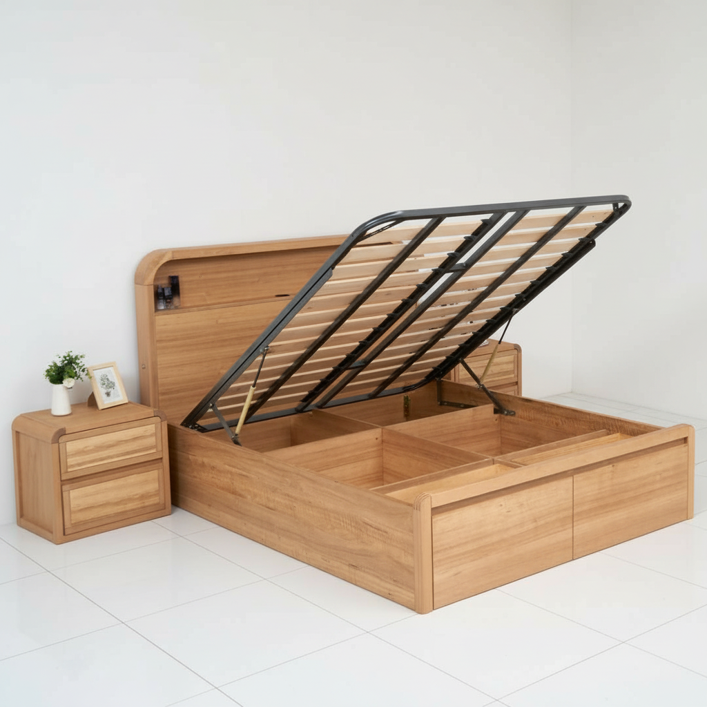 A gas-lift mechanism under the mattress base — meaning you can lift the mattress platform (with assistance) to reveal a spacious hidden under-bed storage compartment. Great for storing bedding, seasonal clothes, extra pillows, or bulky items you want out of sight